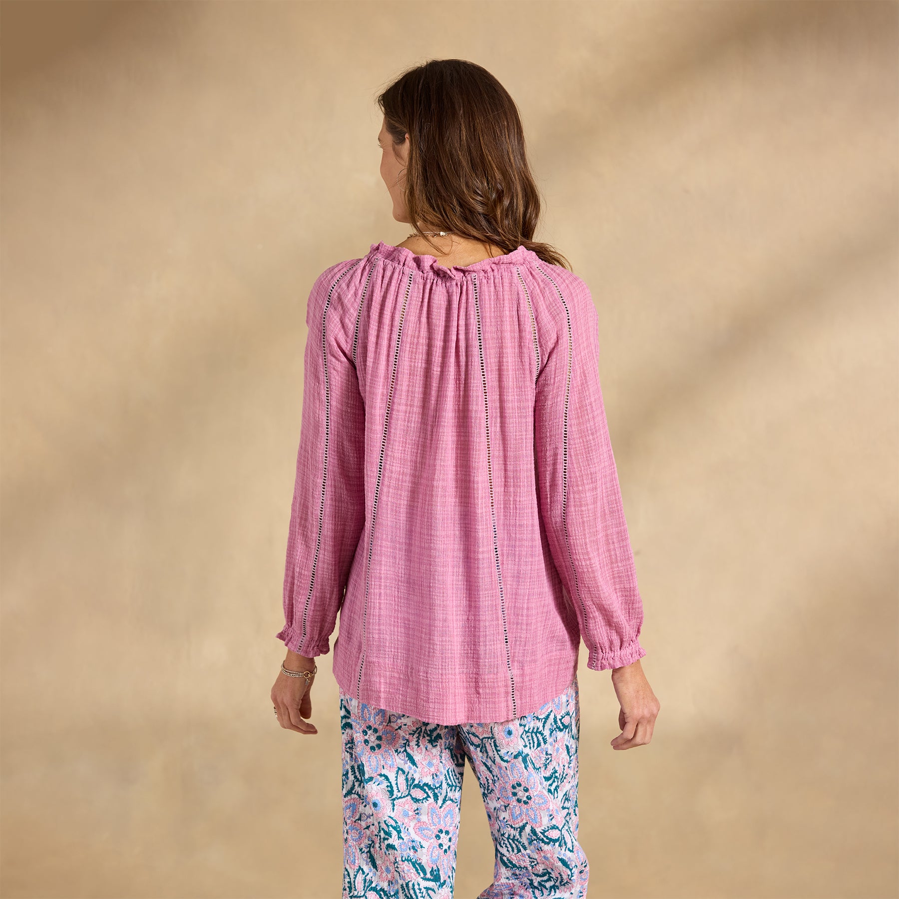 Embrace your artistic spirit in our sheer. easy-fit top with ladder lace. ruffle neckline and tassel ties. Cotton/viscose. Hand wash. Imported. Exclusive. Sizes XS (0–2). S (4–6). M (8–10). L (12–14). XL (16–18). XXL (20–22). Approx. 26.5l