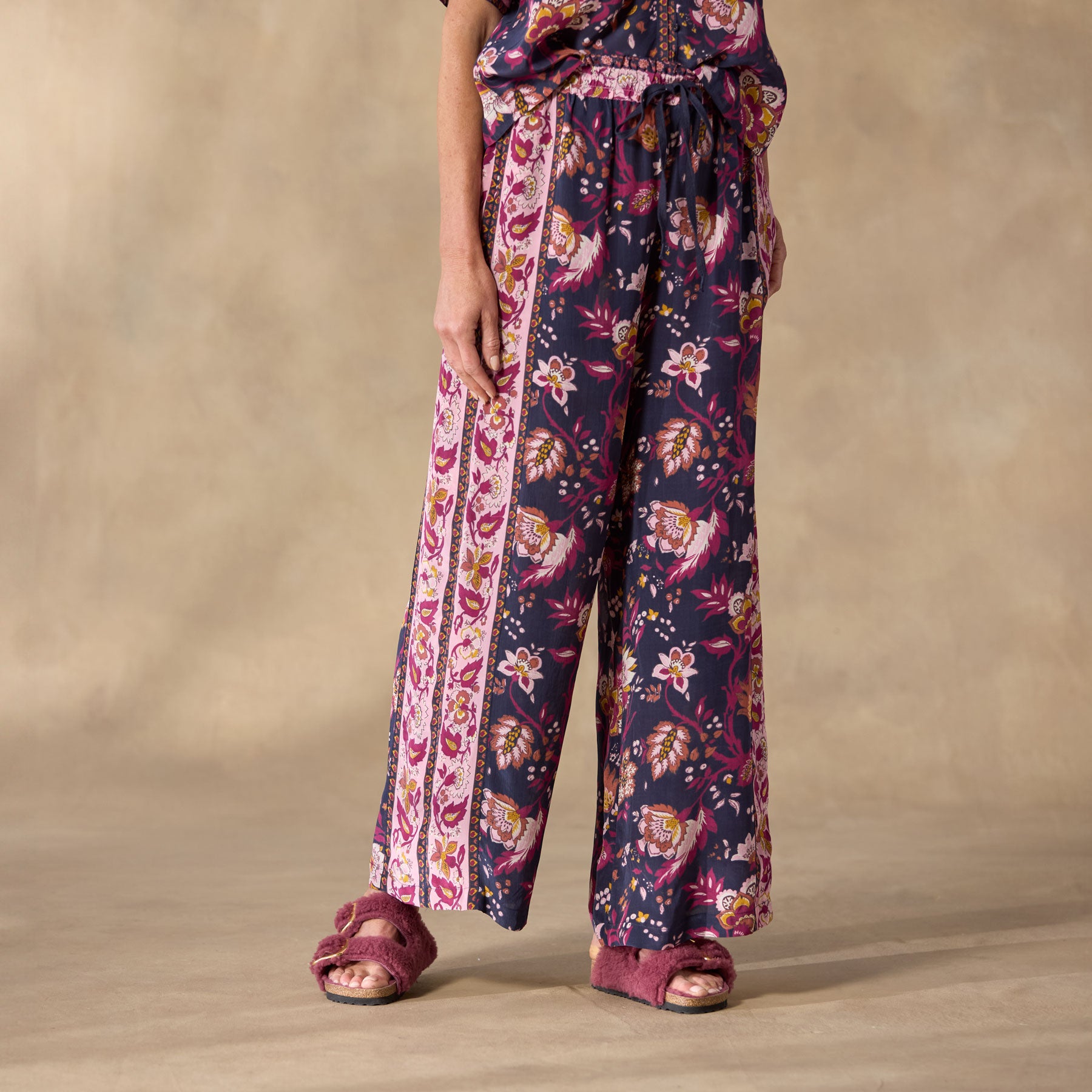 Silky and gorgeous mixed and border print pajama bottoms. so elegant. with wide leg silhouette. elastic drawstring waistband with ruffle detail and side seam pockets. Easy fit and flowing. Viscose. Machine wash. Imported. Exclusive. Sizes XS (0?C2). S (4?C6). M (8?C10). L (12?C14). XL (16?C18). XXL (20?C22). 28 inseam.