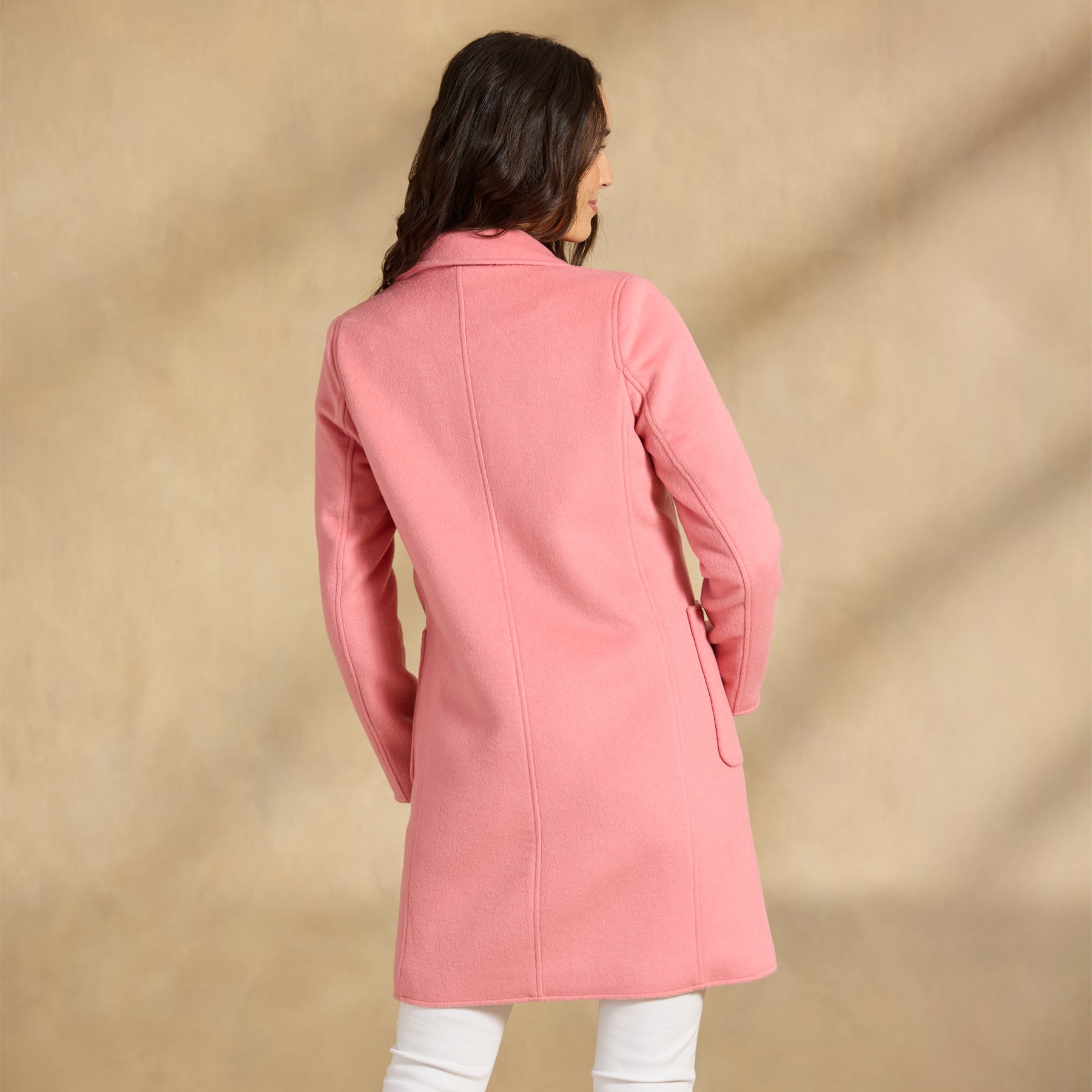 Stylish and bold. our stunning double breasted topper in menswear inspired pinstripes boasts two patch pockets and a contrast print lining. Polyester/wool. Dry clean. Imported. Exclusive. Sizes XS (0–2). S (4–6). M (8–10). L (12–14). XL (16–18). XXL (20–22). Approx. 36l.