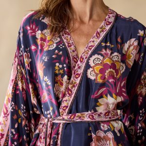 Flowing and feminine. our kimono-style. allover-engineered print robe has border prints. separate belt. side slits and pockets. Viscose. Machine wash. Imported. Exclusive. Sizes XS/S. M/L. XL/XXL. Approx. 44l.