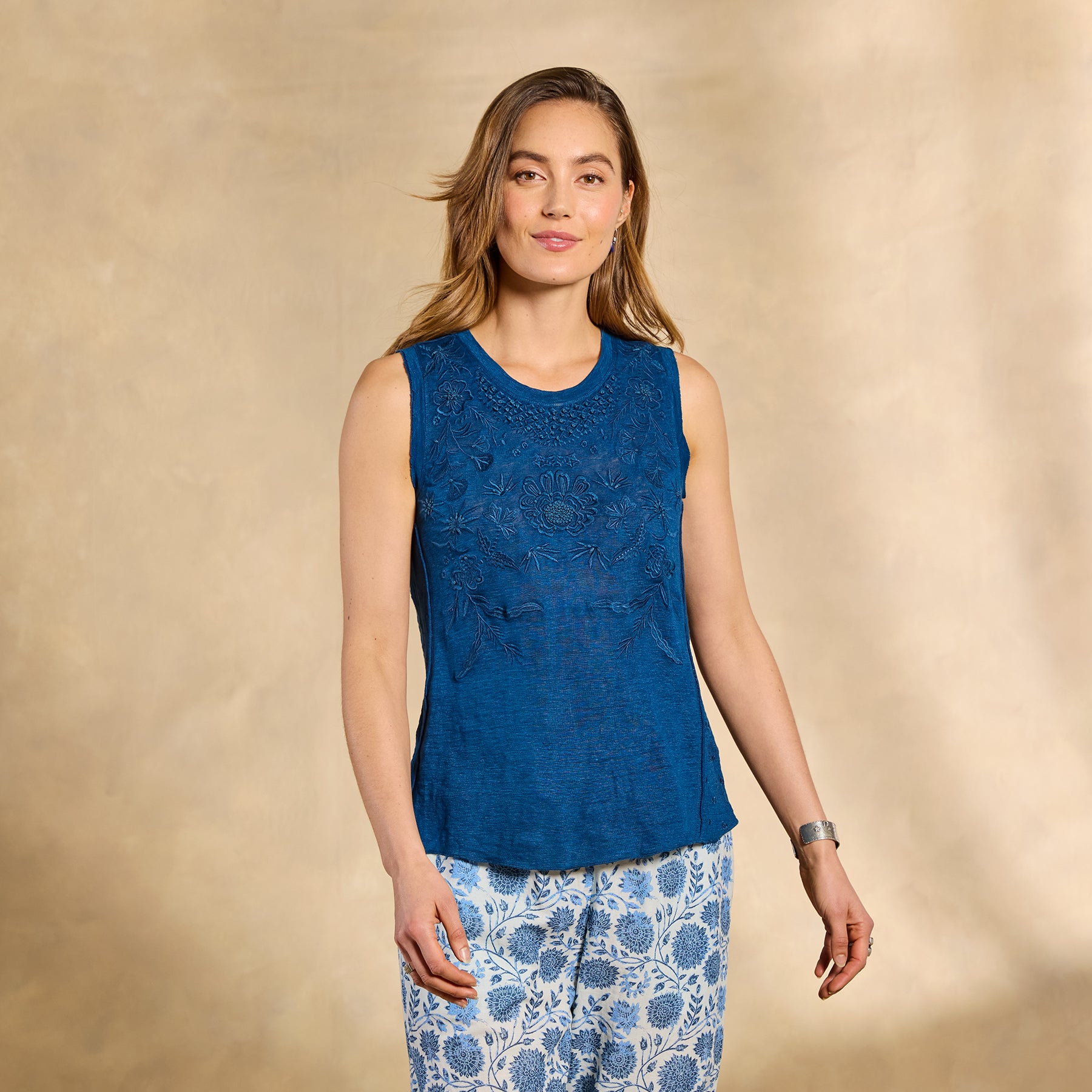 A true statement piece. our breezy linen tank embellished with tonal embroidery. French knot and raw-edge details. scalloped hem and embroidered side panels. Hand wash. Imported. Exclusive. Sizes XXS (00). XS (0 to 2). S (4 to 6). M (8 to 10). L (12 to 14). XL (16 to 18). Approx. 22L.