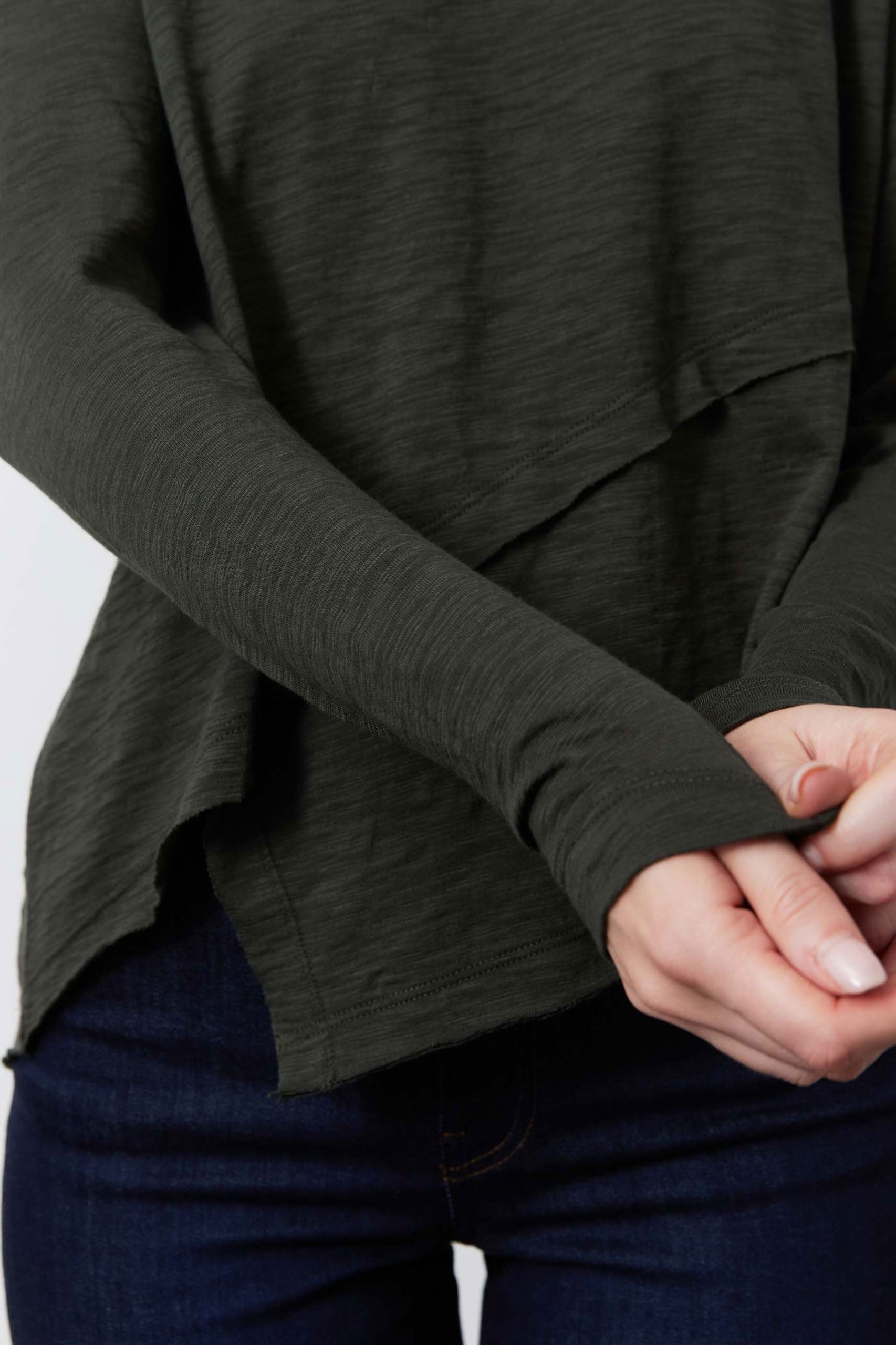 Asymmetric silhouettes are trending for the new season. Make this casual yet stand out piece your new basic with flare. closet staple.