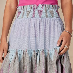 Effortless and graceful. this midi-length tiered skirt sports a jacquard print and an elastic waist. Cotton. Machine wash. Imported. Sizes XS/S. S/M. M/L. Approx. 40l.