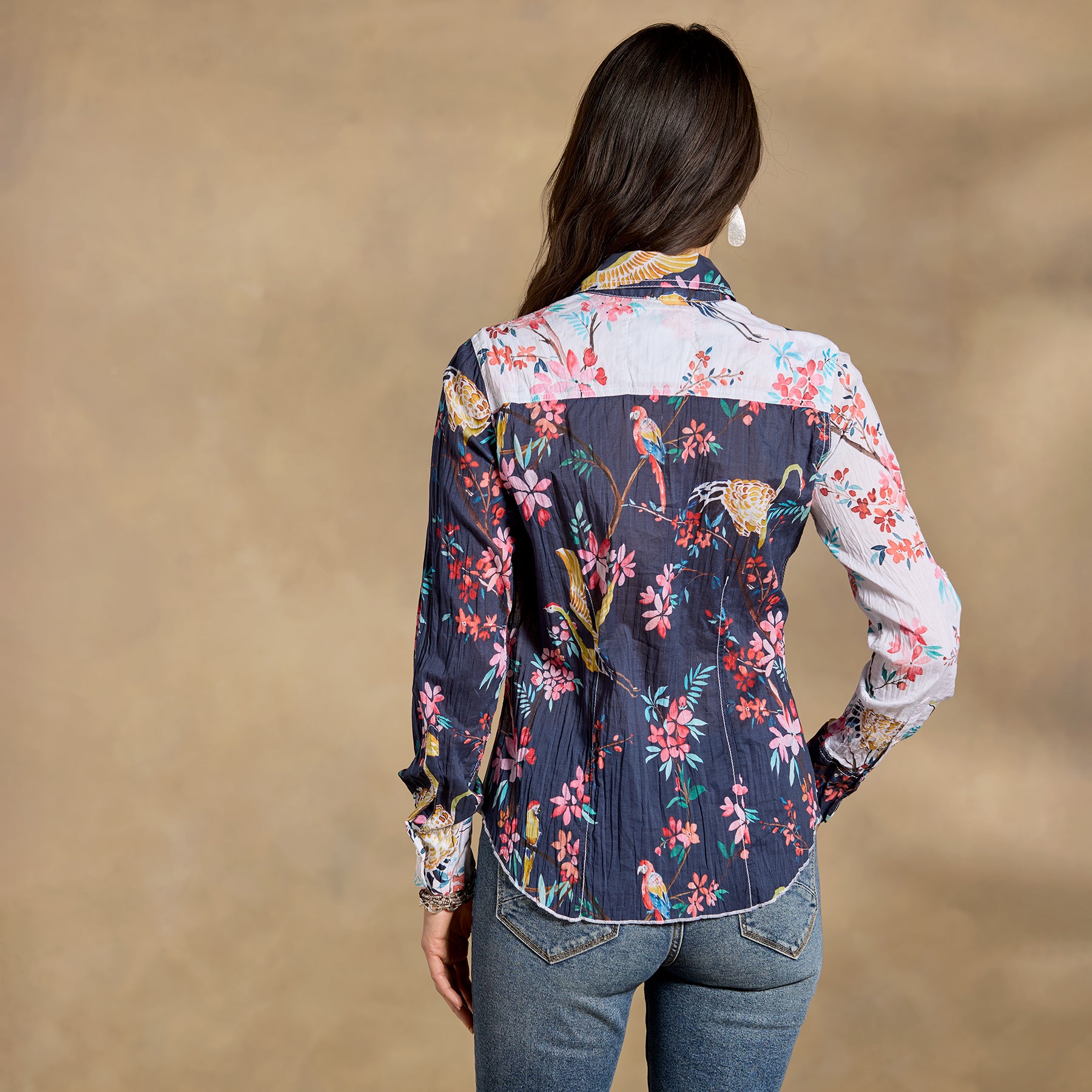 The beautiful gardens of Kyoto. Japan inspired the contrast prints on this light and airy crinkle cotton button-front shirt. Machine wash. Imported. Sundance exclusive. Sizes XXS (00). XS (0–2). S (4–6). M (8–10). L (12–14). XL (16–18). Approx. 25.88l.