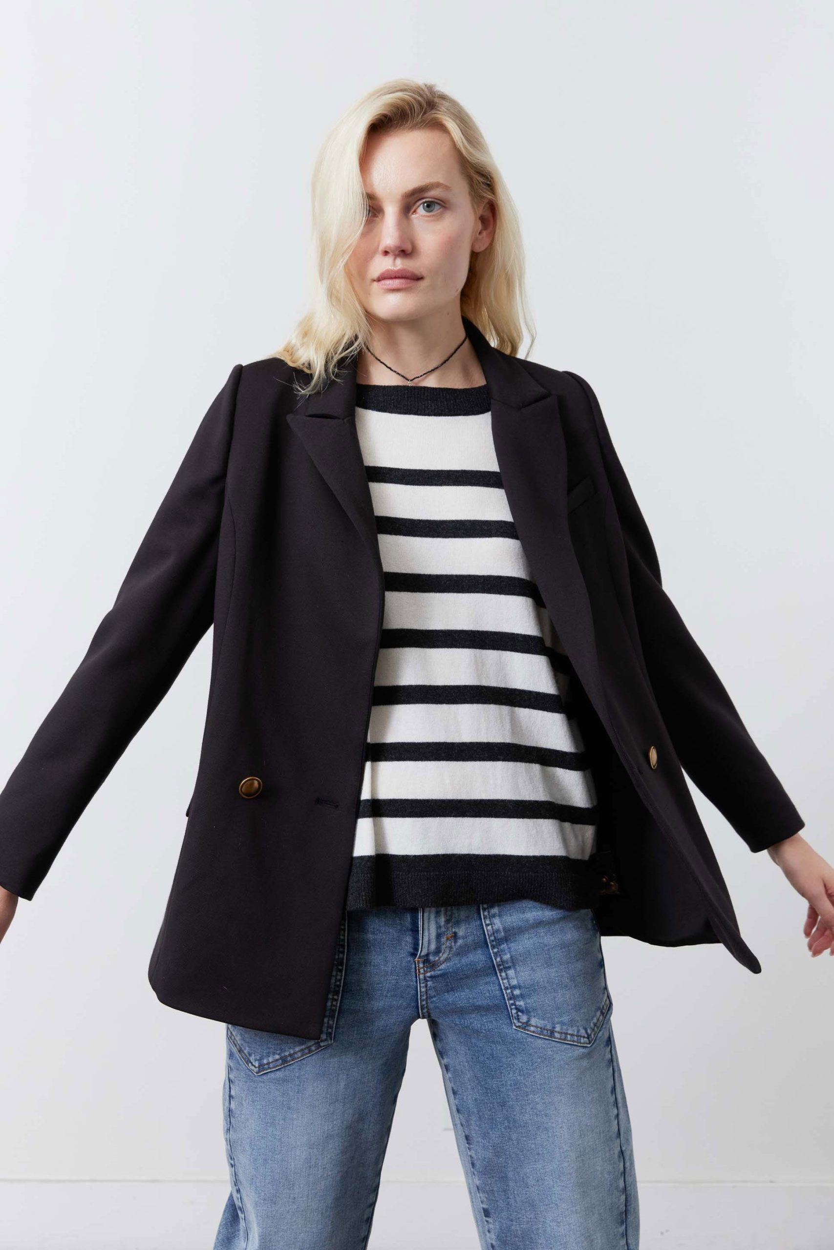 A relaxed take on classic tailoring. This double-breasted blazer is designed with a slightly elongated silhouette and soft structure. giving it an effortless. borrowed-from-the-boys feel while still looking sharp and put together.